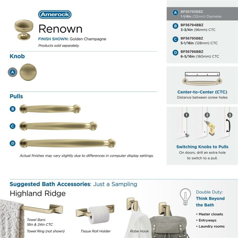 - Complete your personalized look with matching cabinet knobs and drawer pulls from the Amerock Renown collection